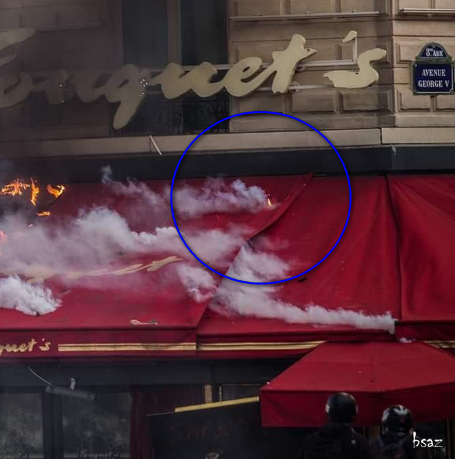 #incendie c'est ce qui se passe ici, au milieu du cercle bleu => nous avons bien un palet de#lacrymogène qui met le feu à l'auvent du#Fouquets, censé être ignifugé ! De rien