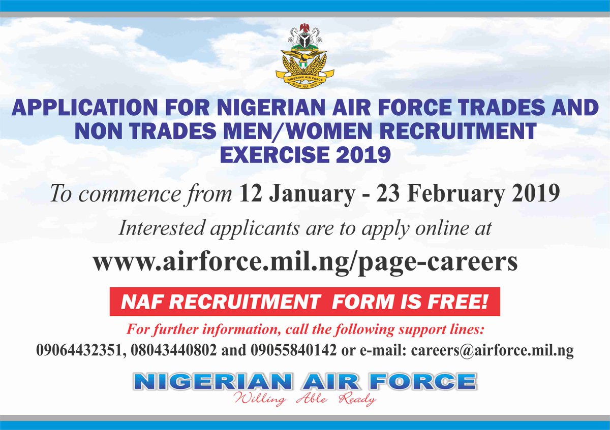APPLICATION FOR NIGERIAN AIR FORCE TRADES AND NON TRADES MEN/WOMEN RECRUITMENT EXERCISE 2019pic.twitter.com/xN01N0ucPz