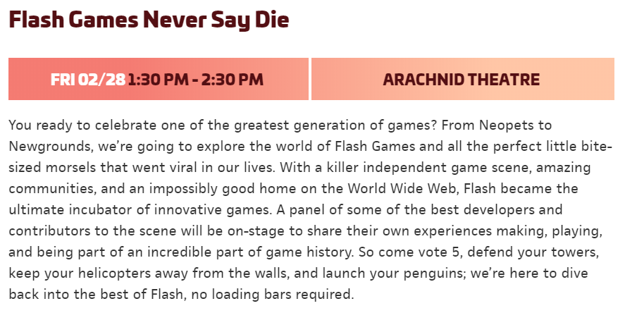We're having a FLASH GAMES PANEL at PAX East! We've got an amazing group and a solid hour of celebrating the devs, communities, and games that made the Flash games scene incredible. Panelists:
