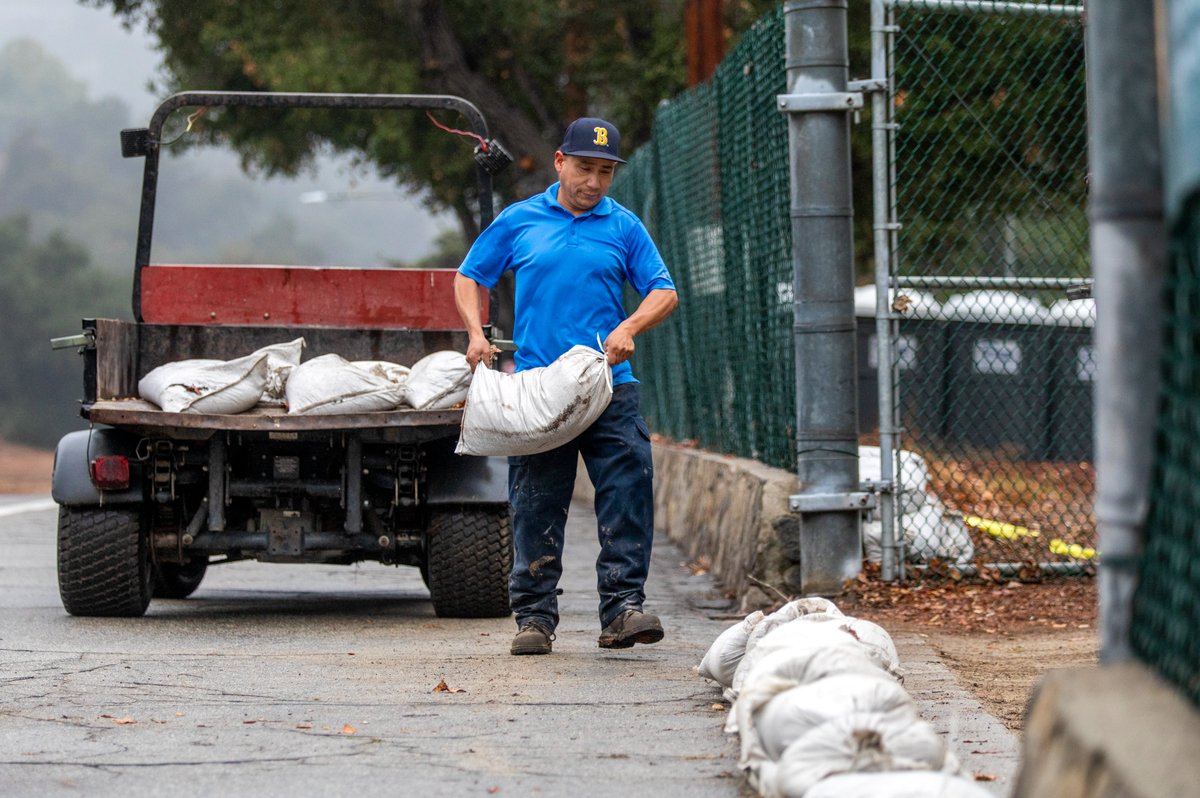 It's starting to rain in Pasadena. Adrian Montellano places sand bags near a gate at Brookside Golf Club near the Rose Bowl. A rainstorm is making its way down the coast.pic.twitter.com/RMtgpOBc3I
