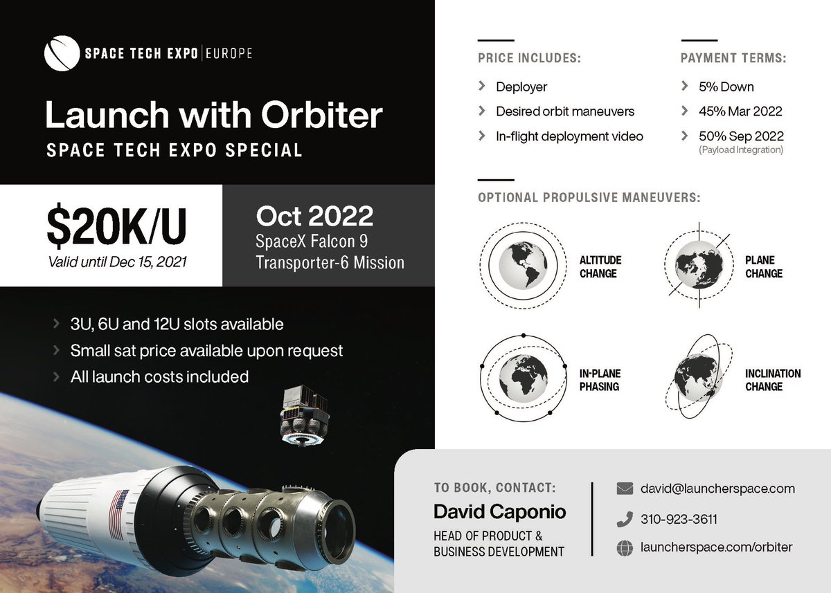@SpaceTechExpoEU special pricing: $20K/U including deployer. Small sat pricing available upon request.pic.twitter.com/WXfNcKtd8L