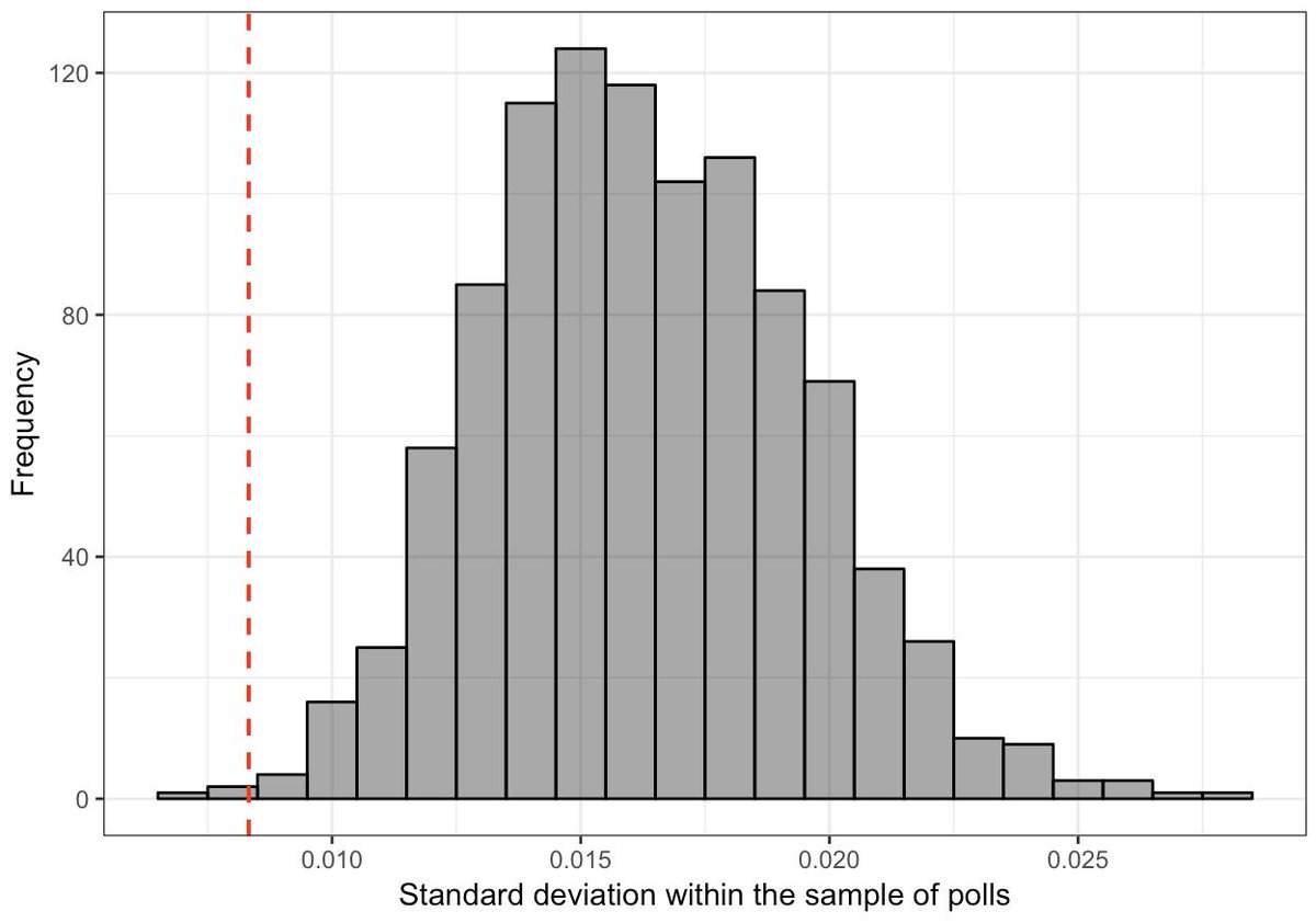 Wir können die erwartete Variabilität simulieren in dem wir die Standardabweichung errechnen die wir in 18 Umfragen mit den jeweiligen Stichprobengrößen erwarten würden -- und sie dann mit der tatsächlichen Standardabweichung vergleichen. (Hier die ÖVP-Werte.) 3/9pic.twitter.com/pYEsvtE3I3