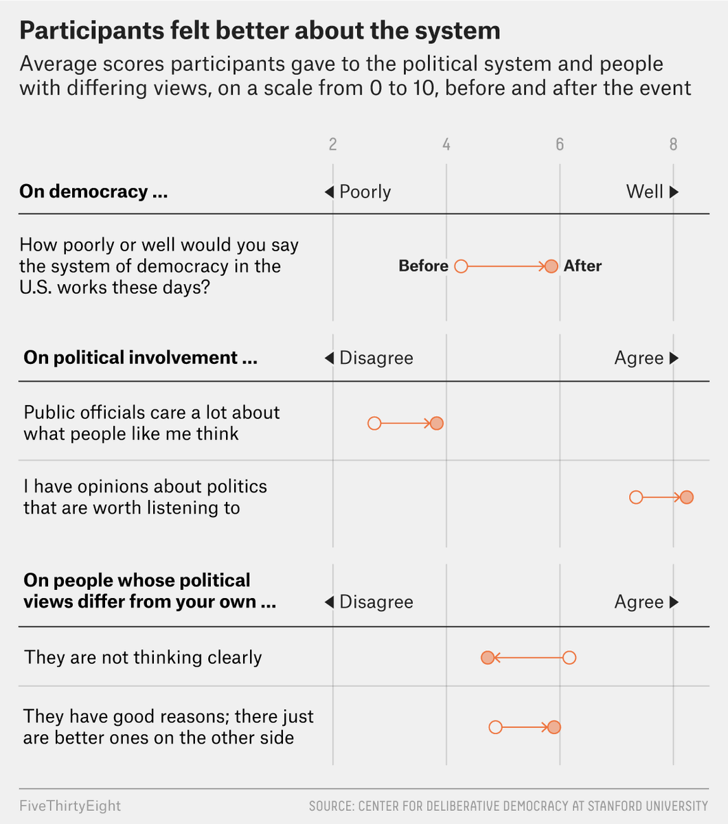 What happens when you spend 4 days talking politics with people you disagree with? Maddie Sach, @sfrostenson and I analyzed an experiment showing that participants left feeling better about people they disagree with, and the system and their place in it. https://fivethirtyeight.com/features/what-would-happen-if-american-voters-all-got-together-and-talked-politics/ …pic.twitter.com/0M3W1fzgNM