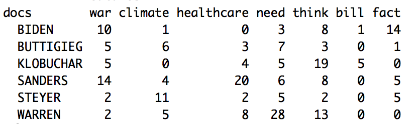 Some interesting words from the #DemocraticDebate. Notable: Steyer's focus on climate, Sanders's focus on health care (this counts "healthcare" and "health care" together), and Klobuchar's emphasis on her legislative record. Also: the women "think" more.pic.twitter.com/P04TssJSEB
