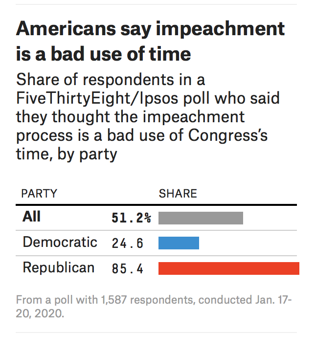 New from @ameliatd and me: Half of Americans -- including a quarter of Democrats -- think impeachment is a bad use of time. Among those, 39% say it distracts Congress from more important issues. https://fivethirtyeight.com/features/half-of-americans-think-impeachment-is-a-bad-use-of-congresss-time/ …pic.twitter.com/mRL1lad6xK