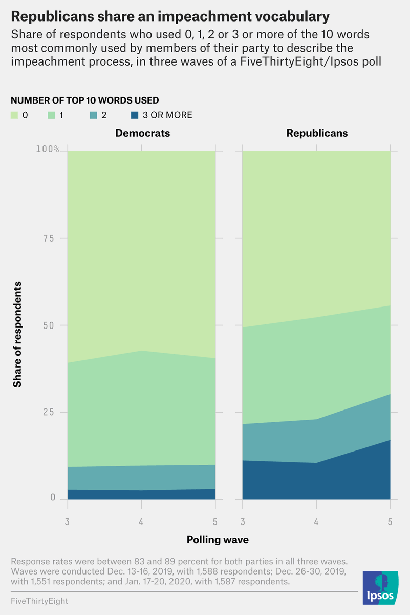 As the top words indicate, Republicans are much more cohesive than Democrats in terms of the number of top words they use in their response. In the most recent wave, 17% used *3 or more* of the top ten words, and more than half used at least one.pic.twitter.com/mg3FhMu51v