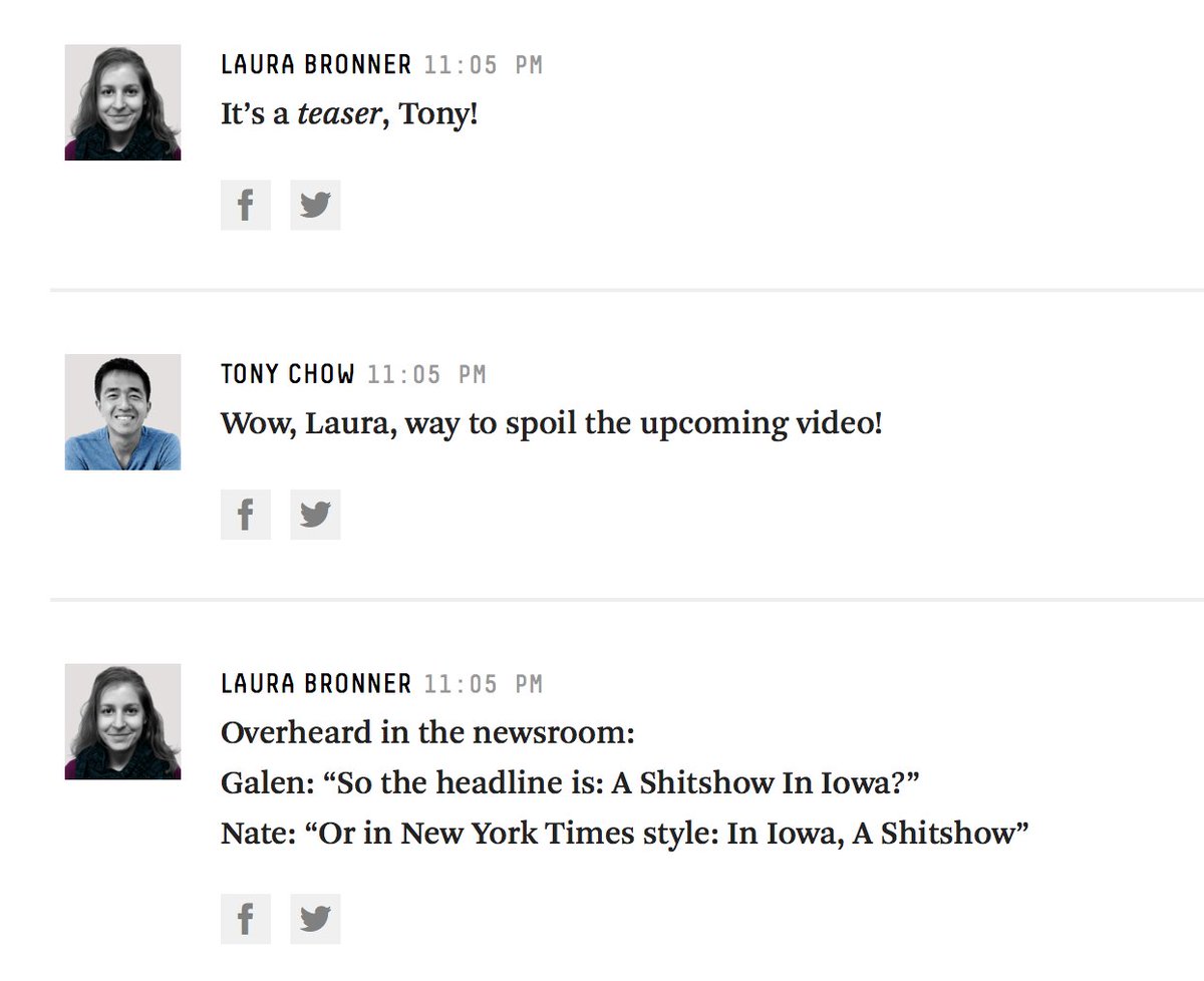 The newsroom's doing great, why do you ask? https://fivethirtyeight.com/live-blog/iowa-caucus-2020-election-live/ …pic.twitter.com/ME7yyOXVHl