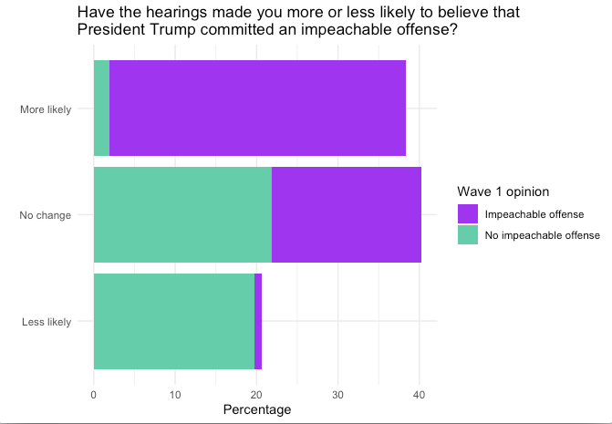 Though obviously (in the above case) people could both already have thought that Trump committed an impeachable offense, and still become (even) more likely to believe that. (Or vice versa.) And of course there are questions we tracked over time!