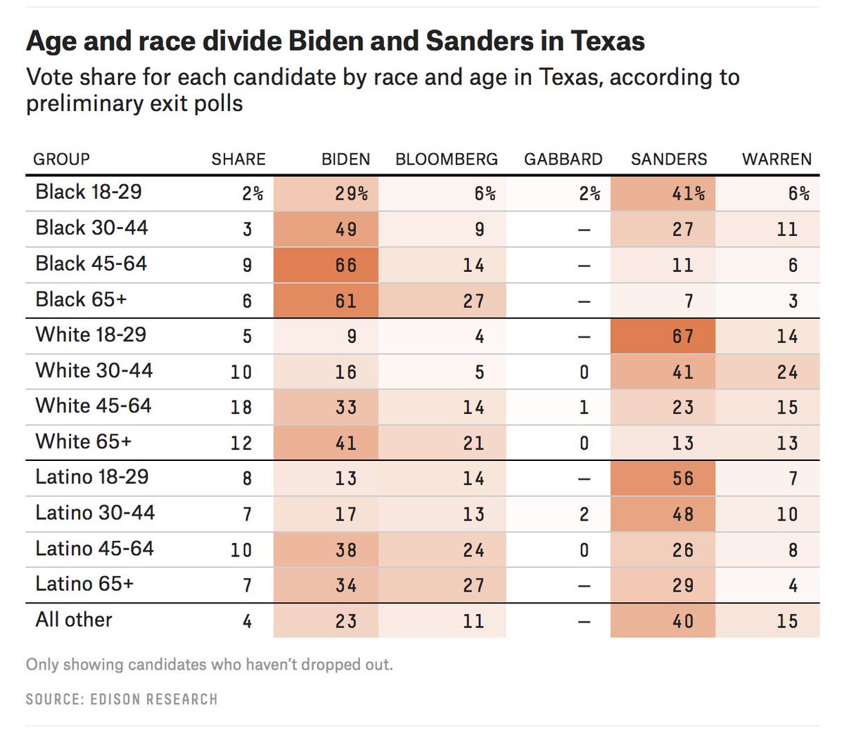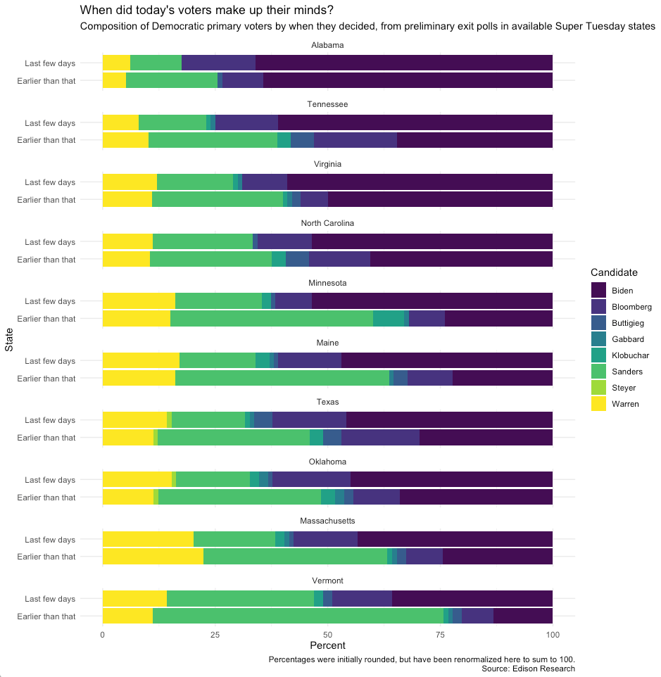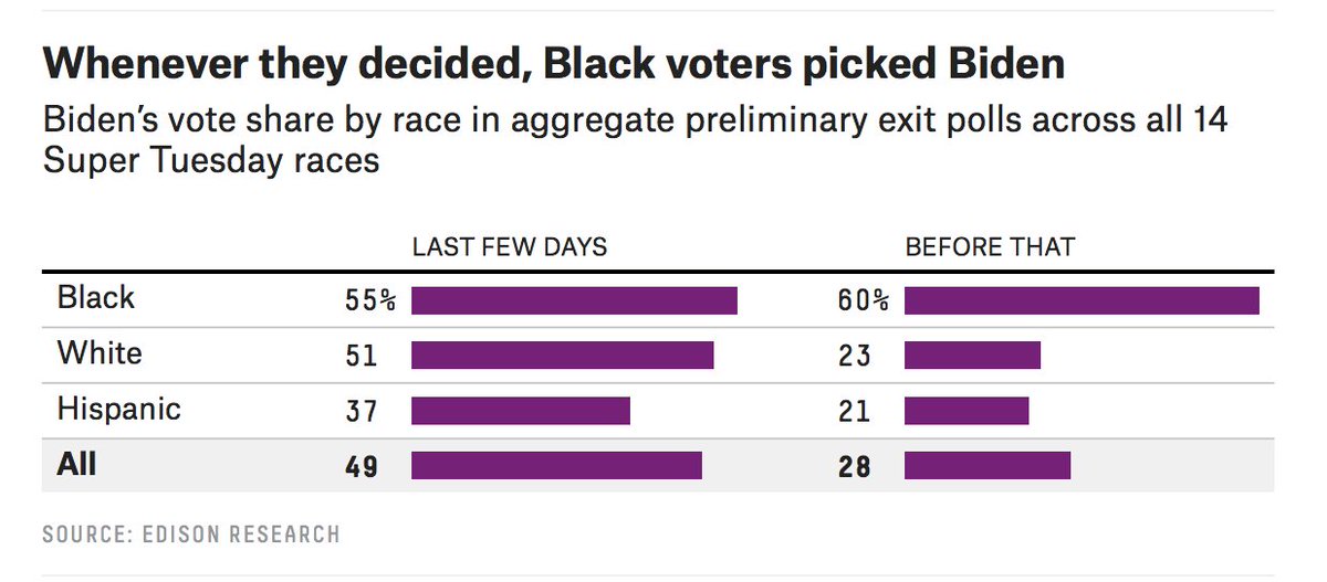 Super Tuesday, in 3 charts: 1. Late deciders broke *heavily* for Biden (& against Sanders) almost everywhere 2. Black voters went for Biden regardless of when they decided 3. Texas exemplifies how age and race divide Biden and Sanders's performancepic.twitter.com/xaXvNF0NkE