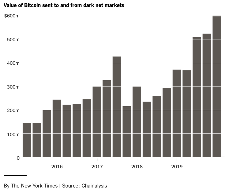 NEW: While most of the Bitcoin economy has been slumping in recent months, illegal activity continued to rise and hit an all-time high, new data shows. In the final months of '19, online black markets attracted $600 million in Bitcoin — up 60% from '18. https://nytimes.com/2020/01/28/technology/bitcoin-black-market.html …pic.twitter.com/lKxE3ZA4XQ