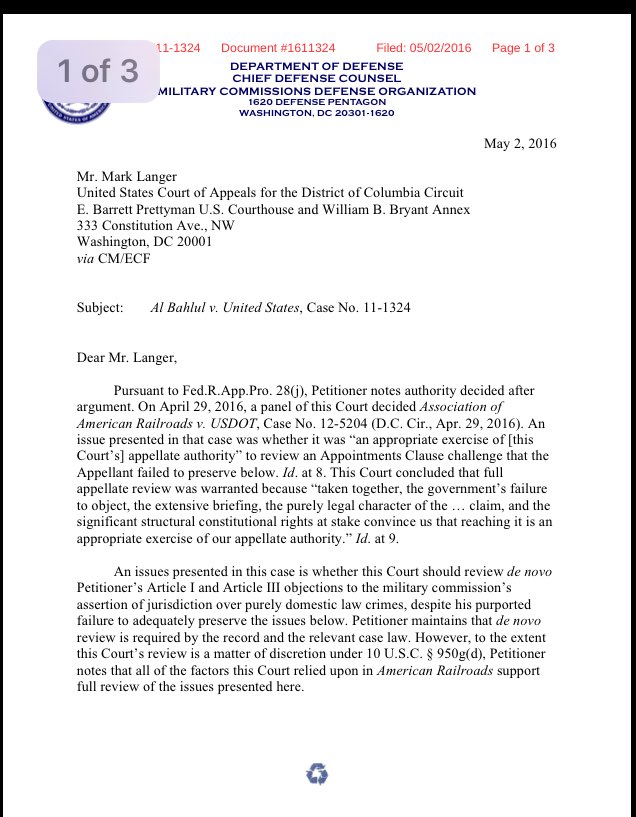 In DC Circuit Guantanamo case, al Bahlul asks court to take note of Friday's Amtrak rulingpic.twitter.com/d5nVWUFzJo