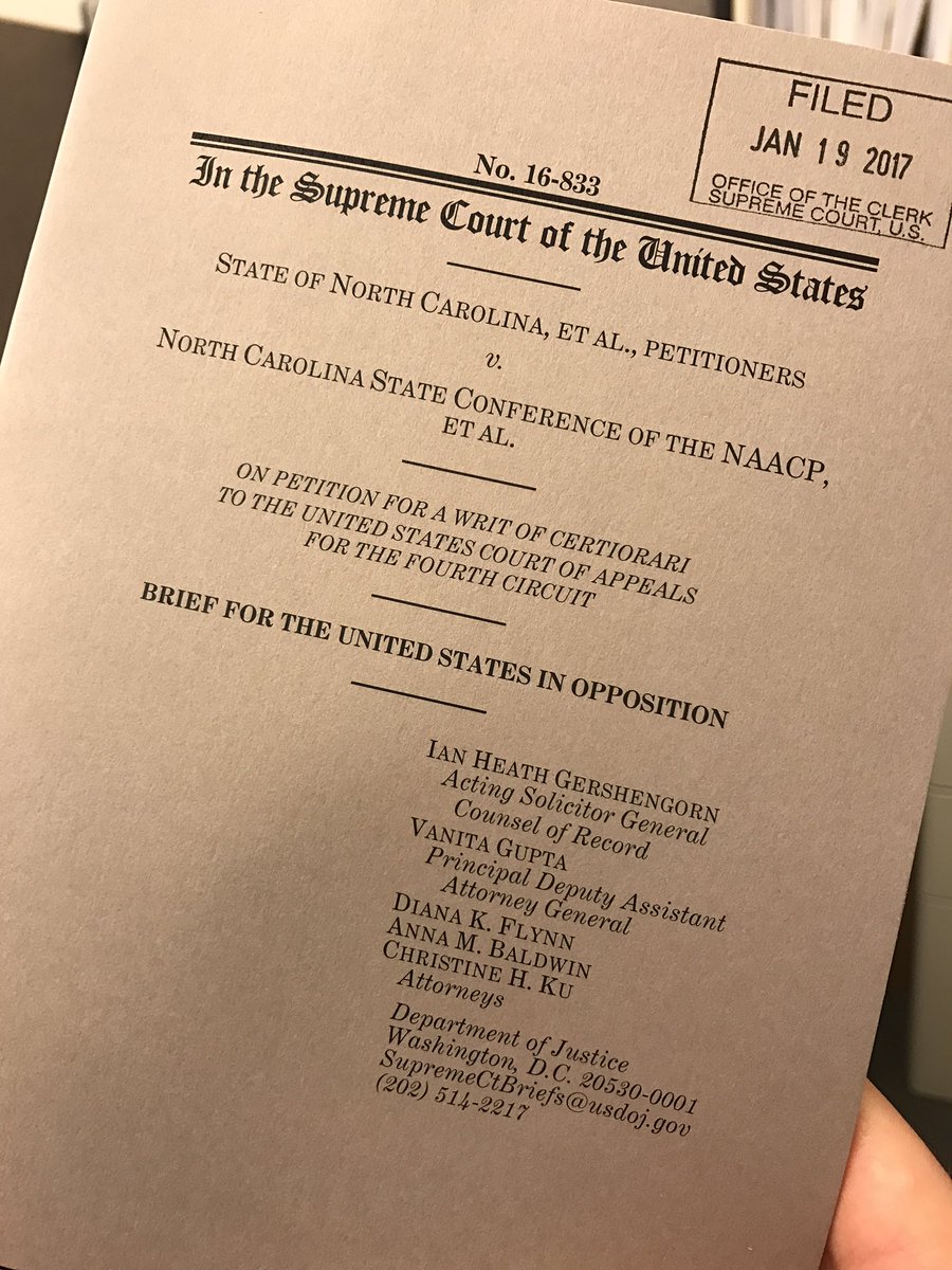 One of the last Supreme Court briefs filed by Obama admin urges court to leave in place ruling striking down NC voter ID lawpic.twitter.com/wCeES1yazM
