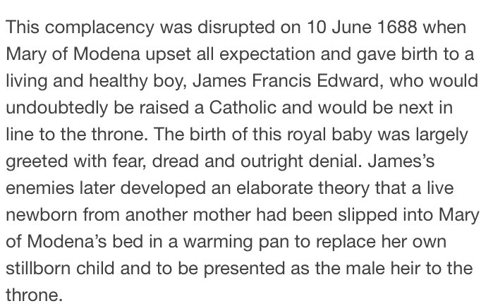 Some 17th century Fake News on the birth of King James II's heir: https://thehistoryofparliament.wordpress.com/2013/07/26/the-warming-pan-baby-james-edward-francis-stuart/ …