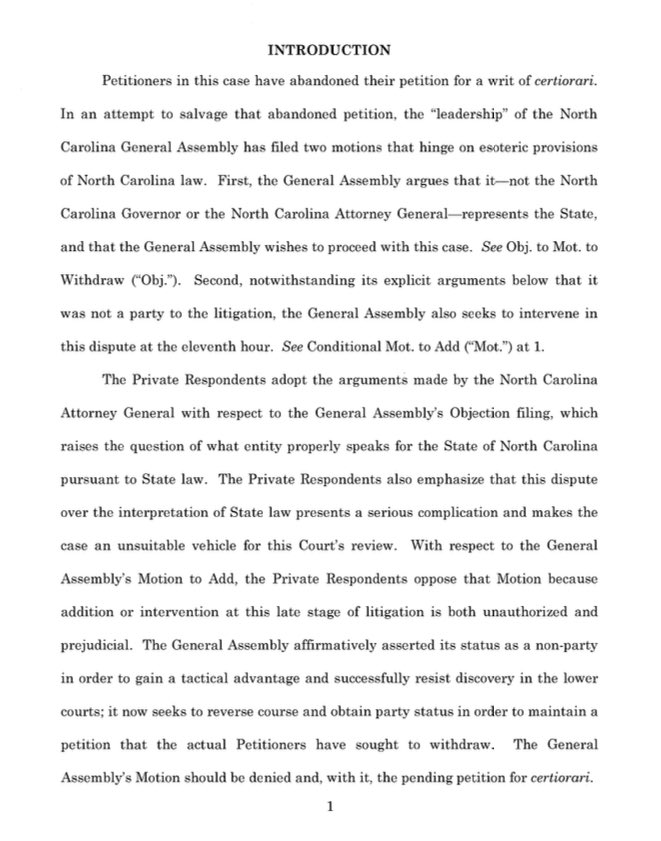 ACLU et al urge Supreme Court not to allow NC legislature to defend voter ID law. Court figuring out what to do after gov/AG withdrewpic.twitter.com/LjlWD29YVS