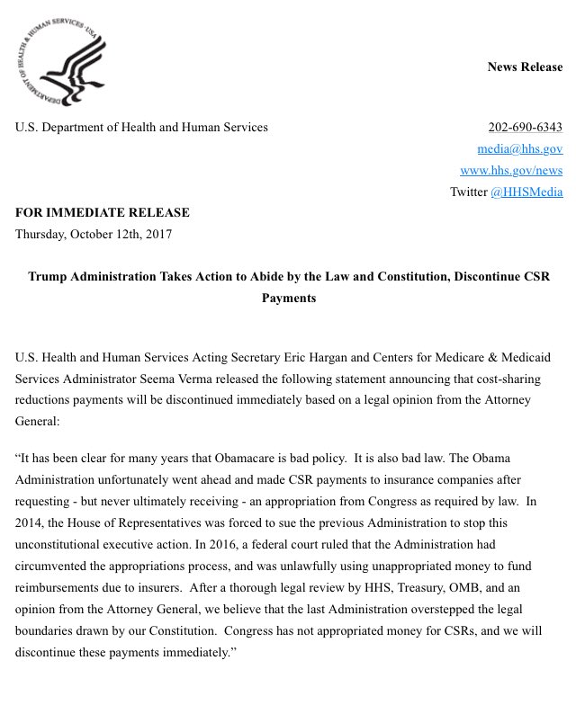 Obamacare subsidy payments to be "discontinued immediately"pic.twitter.com/kBD6YoH0Hd