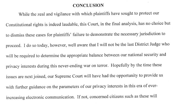NEW: Judge in DC formally dismisses challenge to NSA bulk collection of metadata (some of which is moot b/c Congress has since amended law to end it):pic.twitter.com/QSoSIk9vsU