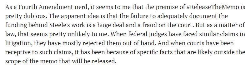 Law prof @OrinKerr on why Steele's links with Dems not that legally relevant when it comes to seeking a warrant (written before memo released): https://lawfareblog.com/dubious-legal-claim-behind-releasethememo …pic.twitter.com/iiTPXO3PBd