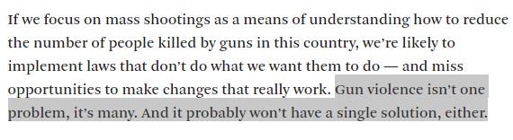 now you are conflating gun deaths and mass shootings. they are very different problemshttps://fivethirtyeight.com/features/mass-shootings-are-a-bad-way-to-understand-gun-violence/ …