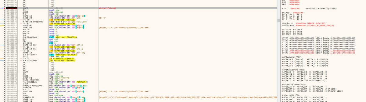 What I did for debugging is: Spin up x64dbg with sigcheck.exe and debug your way through WinVerifyTrust (wintrust.dll).pic.twitter.com/lgdwJmMAlf