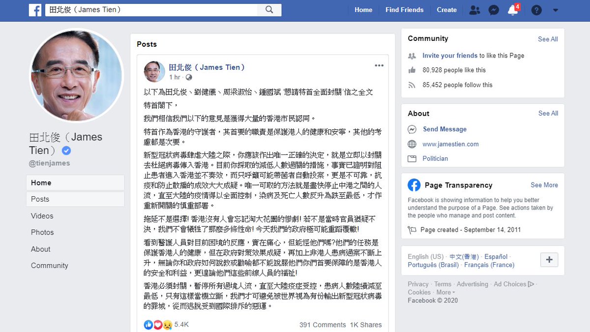 #CarrieLam, urging her to shut down all ports connecting with#China to protect safety of#HKers and avoid global discrimination.#ChinesePneumonia Source: Facebook https://fb.com/tienjames/posts/3497715866936441 …pic.twitter.com/qVbuhqczW2