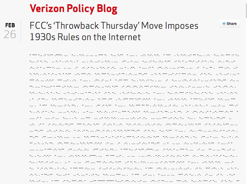 @Verizon's response to yesterday's FCC net neutrality ruling was in morse. http://publicpolicy.verizon.com/blog/entry/fccs-throwback-thursday-move-imposes-1930s-rules-on-the-internet …pic.twitter.com/dNeHtvcL4O
