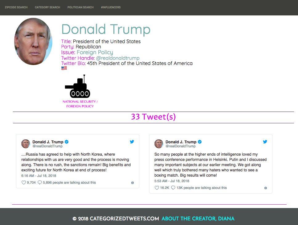 Love this!! The only thing I do find myself wanting to do is be able to click into a category within a politician’s tweets and see what their opinions on the issue are — negative or positive!