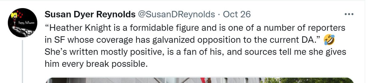 Oh stop it, @ScottHech from L.A. @heatherknightsf writes about everything from the school board to Muni to rollerblading down the Great Highway. She rarely writes about @chesaboudin and has remained mostly neutral on him. In fact, she’s moved on. So should you. 🙄 https://twitter.com/ScottHech/status/1454860114666536961 …pic.twitter.com/tEYsYNTn4p