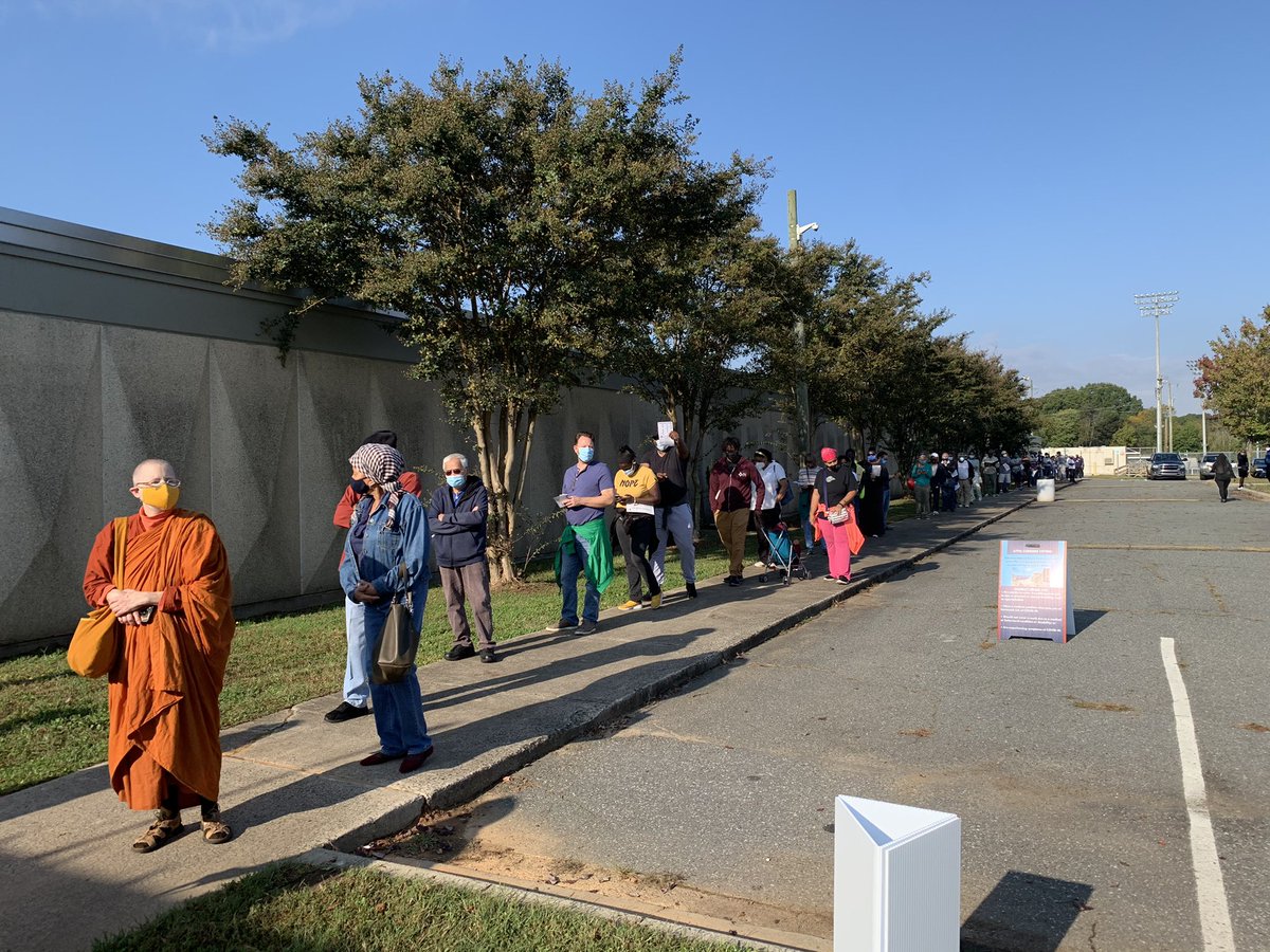 Good morning from the Bojangles Entertainment Complex on the first day of early voting in North Carolina. I counted ~150 people in line a few minutes before polls open at 8. Folks are coming with masks, coffee and voter guide info while they wait.pic.twitter.com/UqNm6OEtKp