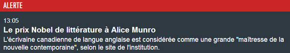 @lemondefr: (Dernière minute) Le prix#Nobel de littérature à Alice Munro pic.twitter.com/R6i3euBkpk”