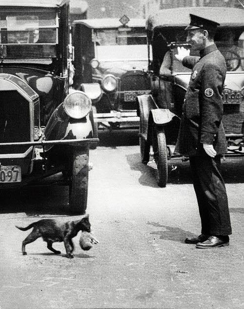Picture taken circa 1925 when a NYC policeman stopped traffic to allow a mama cat and her baby to cross the street.pic.twitter.com/WeAA5llaju