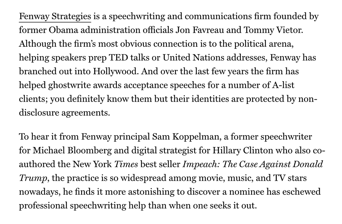 That Hollywood awards-season acceptance speeches are penned by a firm run by Obama aides and Clinton strategists is a small, telling brushstroke: https://www.vulture.com/2020/02/who-is-writing-brad-pitts-awards-season-speeches.html …pic.twitter.com/k4gNxEIyzk