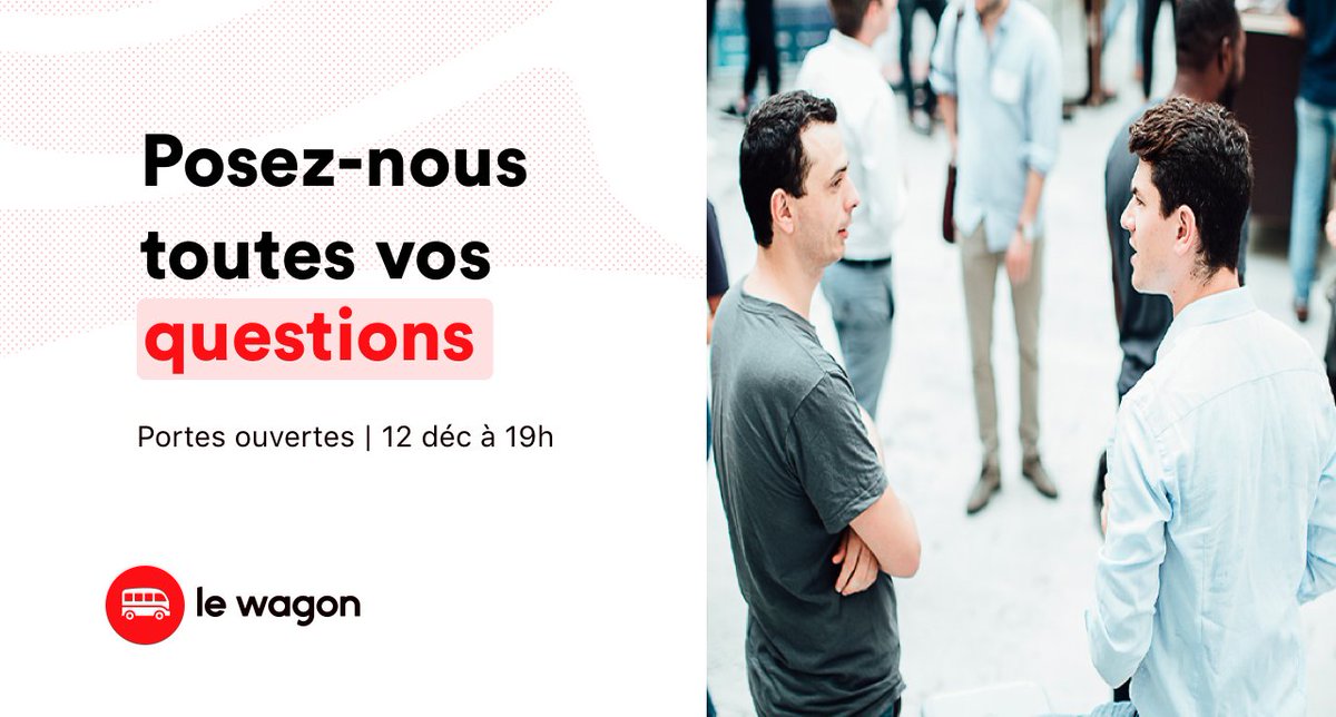 [PORTES OUVERTES - BOOTCAMP À TEMPS PLEIN] Tu souhaites rejoindre la prochaine session du Wagon pour apprendre à coder et tu as encore quelques questions ? Rendez-vous demain à 19h pour rencontrer notre équipe & échanger avec nos anciens étudiants