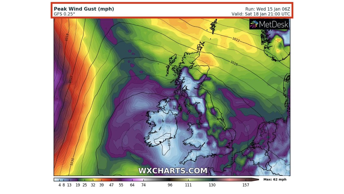 The article shown in the previous tweet refers to a 'shock map' that shows the alleged '150mph winds.' This is based on weather data from the 6am Wednesday issue of the GFS American weather model - freely available to view on the WXCharts weather website.pic.twitter.com/iLKisQ5Z8Q
