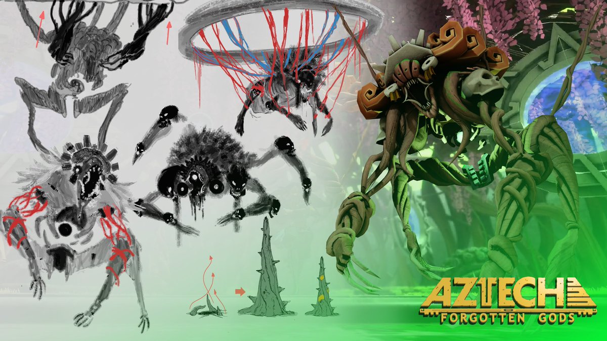 The concept art is fundamental in the development of a video game. For Tlaltecuhtli, there are some concepts about her cultural representation like her red curly hair, meant to represent the Malinali. The Aztec glyph for the interwoven connection between light and dark matter.pic.twitter.com/1FMOzooXMw