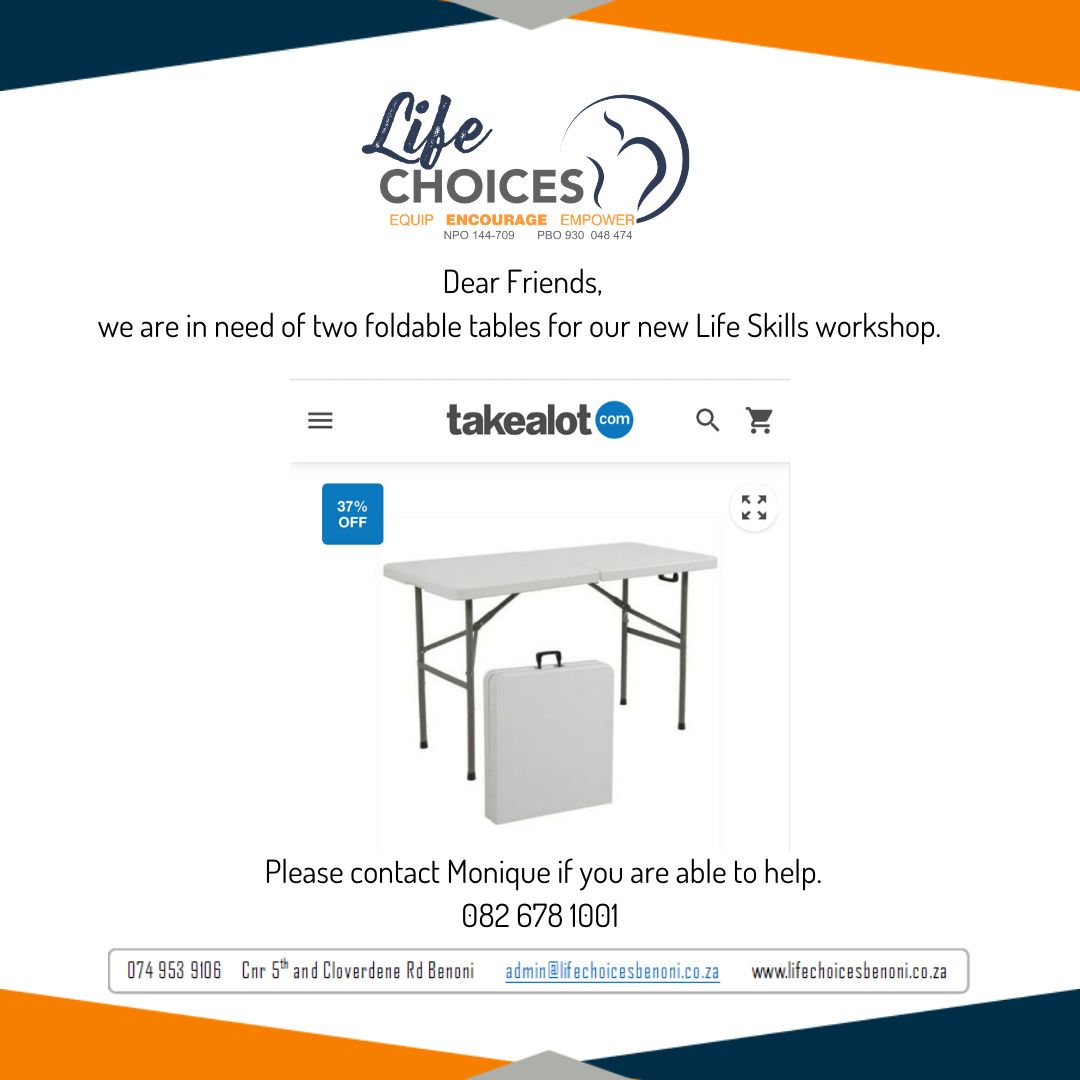 Hi Friends, we are in need of two tables for our Sanitary Towel Workshops. If you are able to contribute please contact Monique @ 082 678 1001.