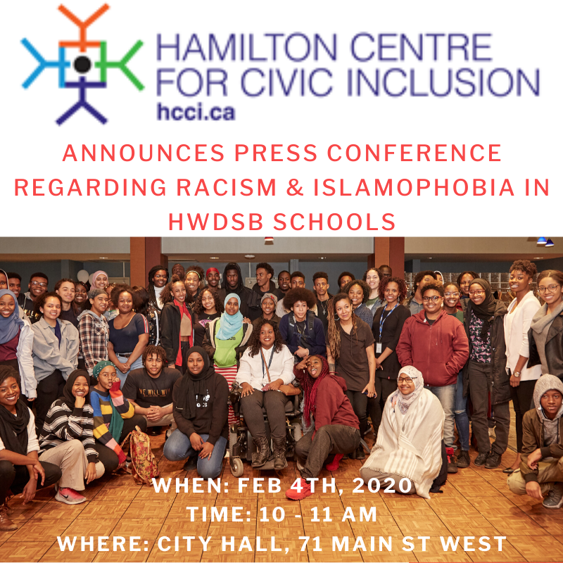 @HCCI1 will hold a news conference with@HWDSBKids & students at 10 am. Tuesday, February 4th, 2020 at City Hall (71 Main St West) to talk about high school student’s experiences of#Racism &#Islamophobia within the public school board and offer recommendations.#HamOnt#onpolipic.twitter.com/4MGvsJfN3P