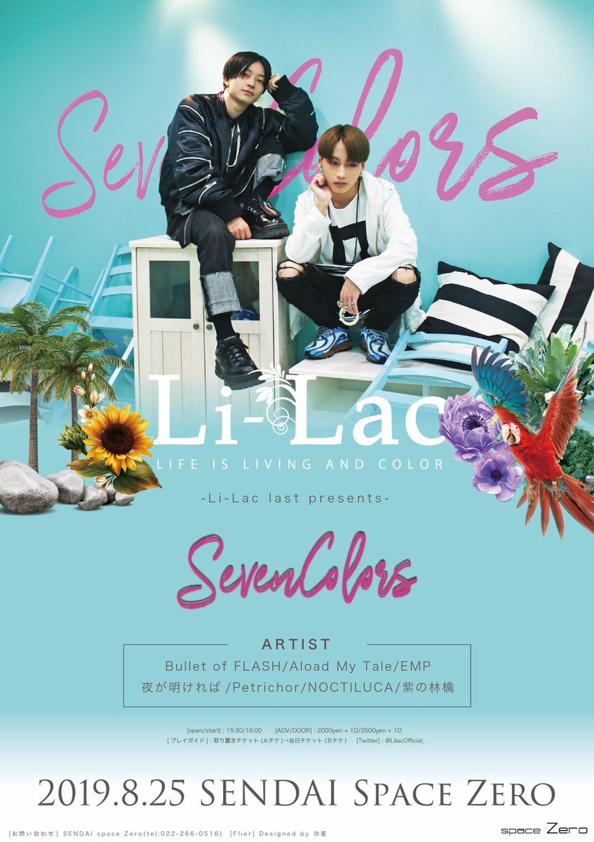 【大切なお知らせ&拡散希望】 この度活動休止していましたLi-Lacは8月25日をもちまして解散する運びとなりました。 それに伴い解散企画 Li-Lac last presents『SEVENCOLORS』を8月25日主催決定! Bullet of FLASH Aload My Tale EMP 夜が明ければ NOCTILUCA Petrichor 紫の林檎 が出演決定!pic.twitter.com/4CJA0AdwEo