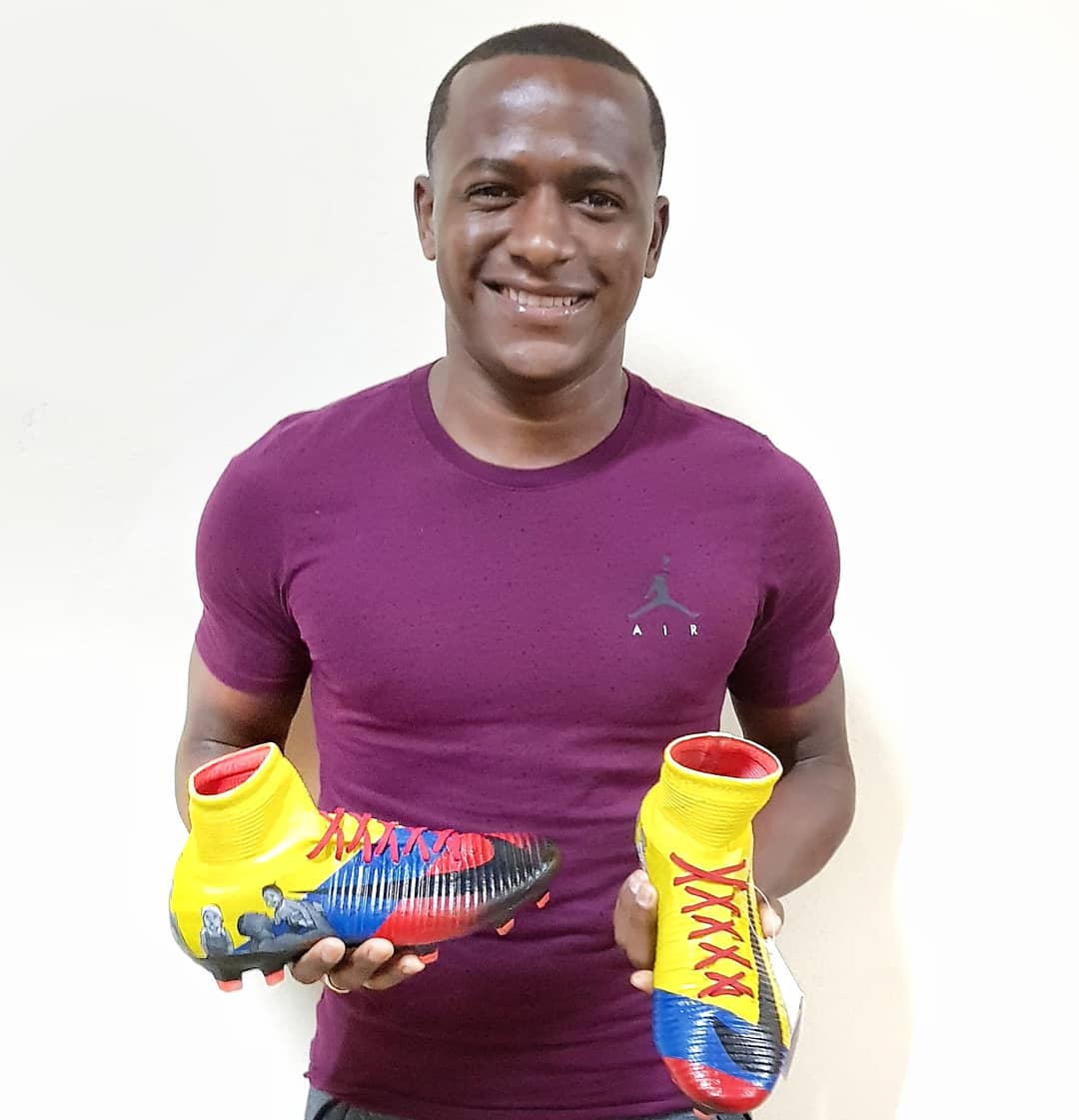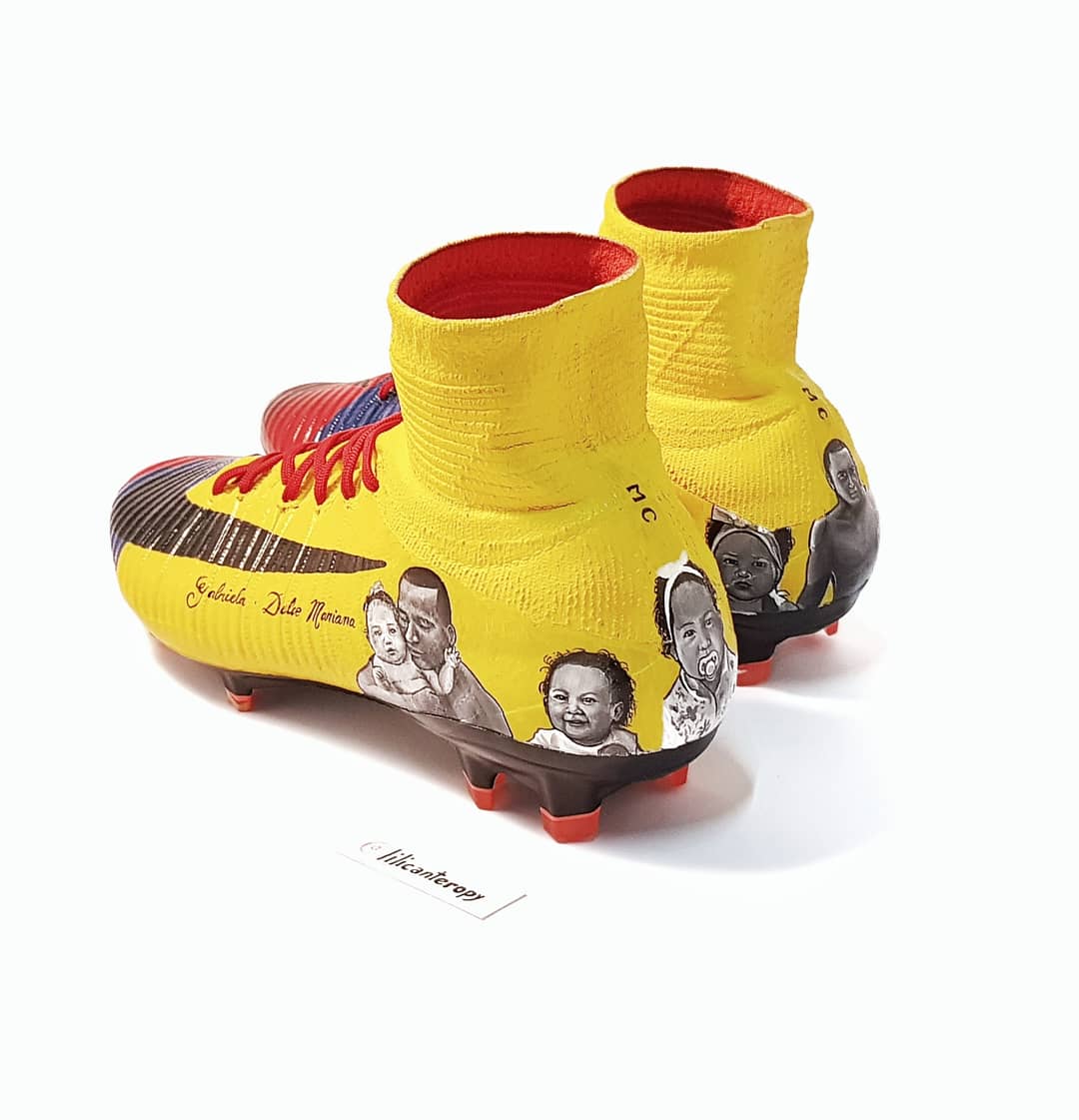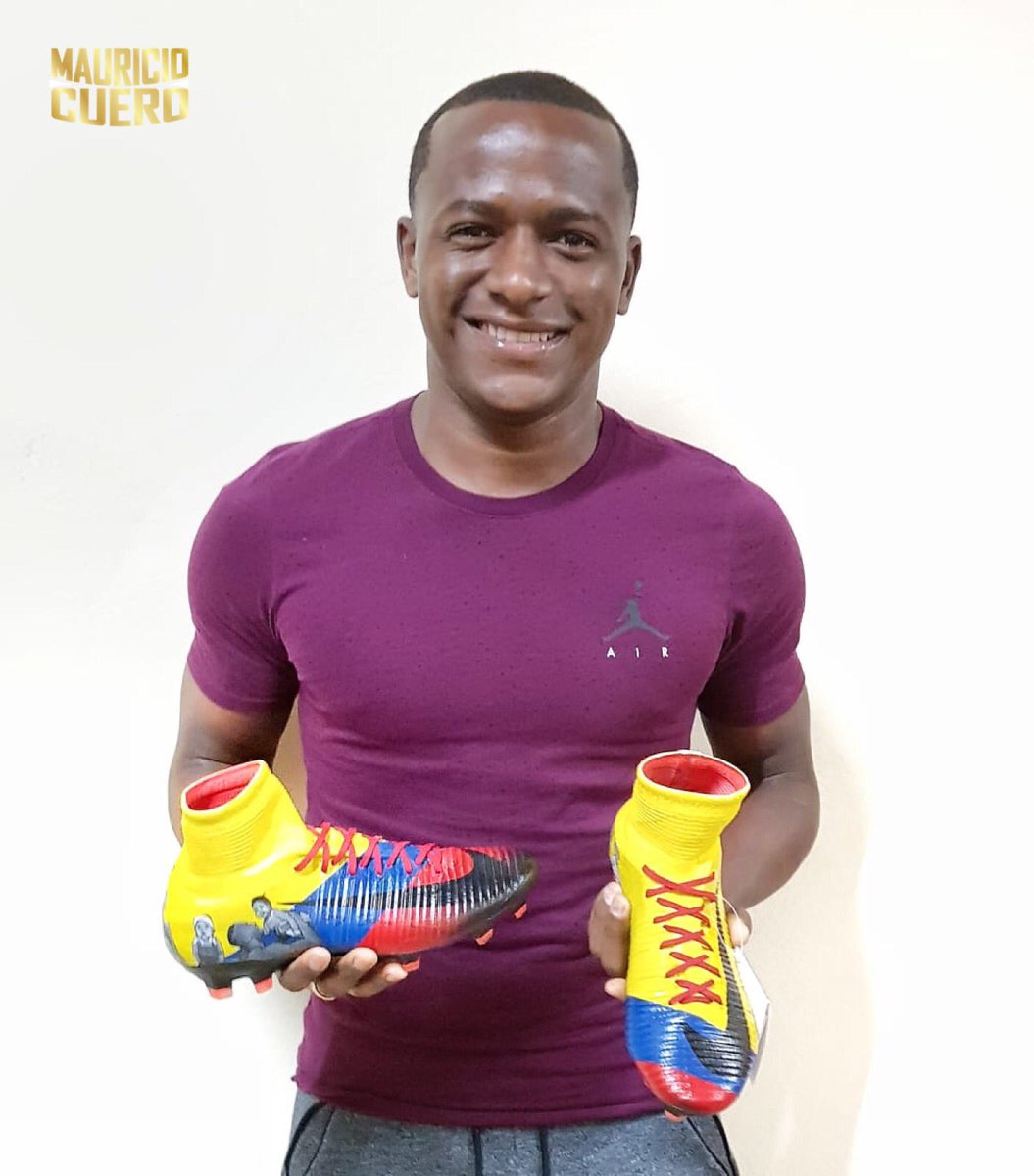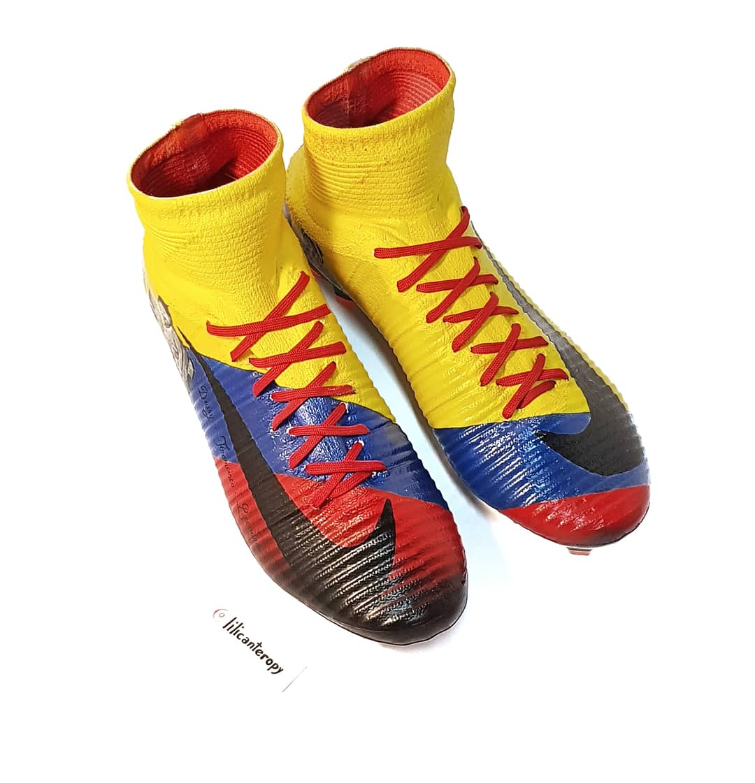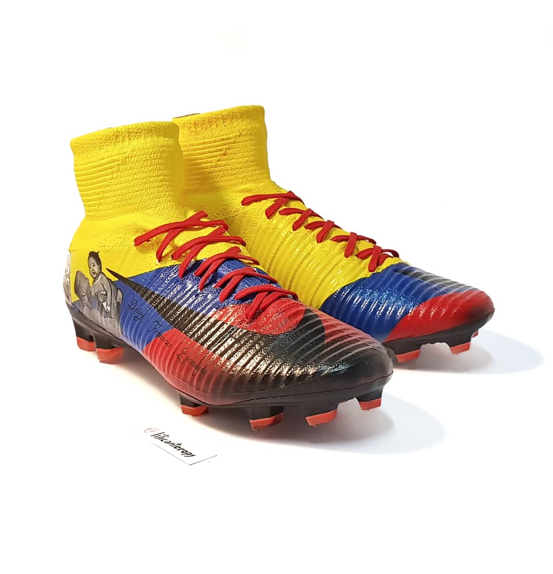 Botines personalizados para Mauricio Cuero @maurocuero7, pintados a mano con los colores de la bandera de Colombia