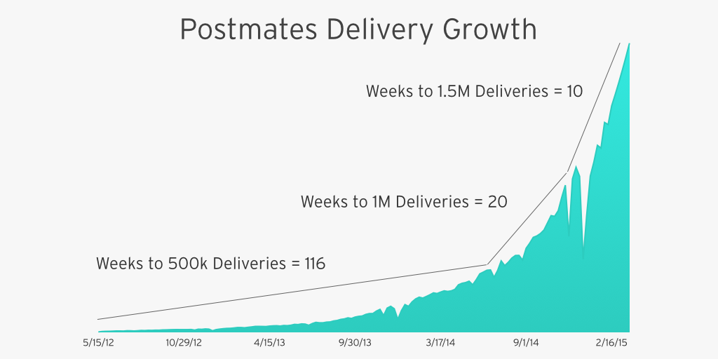 @postmates: 116 weeks to get to 500K deliveries, 20 weeks to 1M and 10 weeks to 1.5M!pic.twitter.com/l4SrvBVjFE