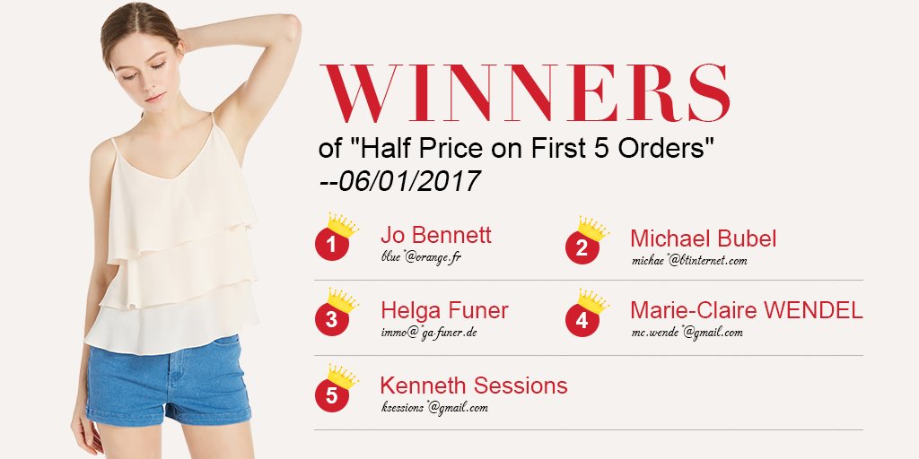 Congratulations! The 5 winners of "Half Price on First Five Orders" on 06/01/2017 New arrivals land on the 1st & 3rd Thursday Each month!pic.twitter.com/qP44r97K8a