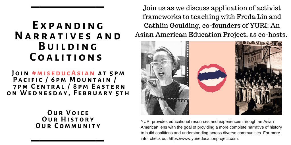 @yuri_education w@cath_goulding as we moderate the#miseducAsian Twitter Chat on teaching thru an Asian American#APIDA lens to change perspectives. Plz join & share!@DrADM75@rsiasoco@ProfaSantiago@YuhJiYeon@harajukugirl135@FreedomLifted@UCBHSSP@kawai_laihttps://twitter.com/miseducAsian/status/1224495008788566016 …