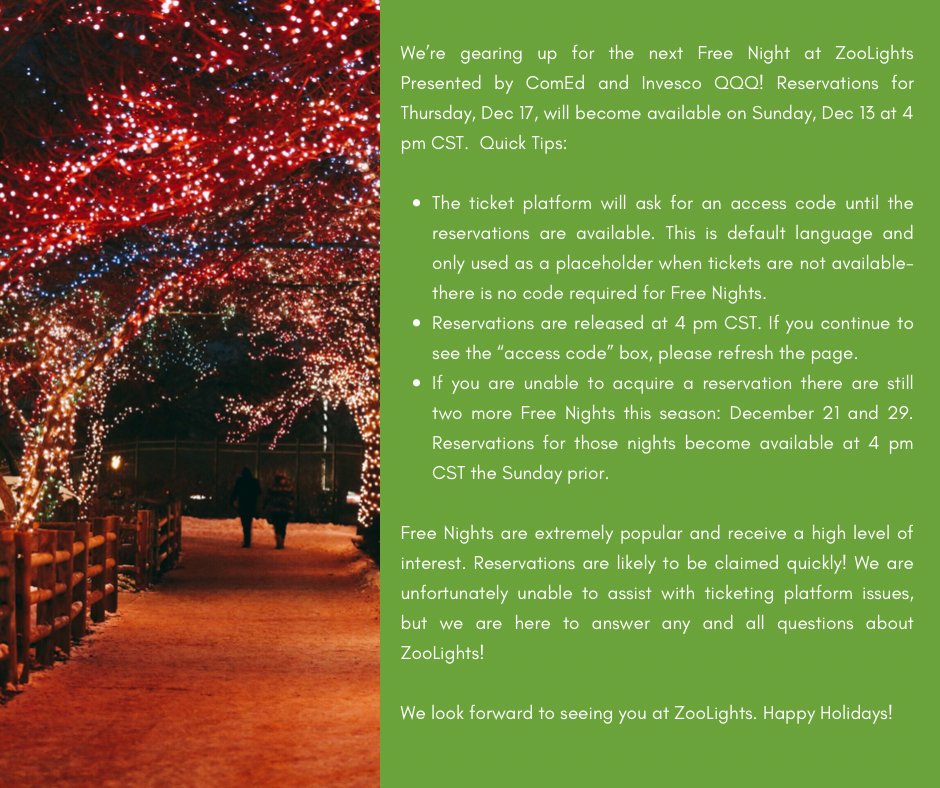 We’re gearing up for the next Free Night at ZooLights Presented by ComEd and Invesco QQQ! Reservations for Thursday, Dec 17, will become available on Sunday, Dec 13 at 4 pm CST. Quick tips:pic.twitter.com/LJAbe0ItFF
