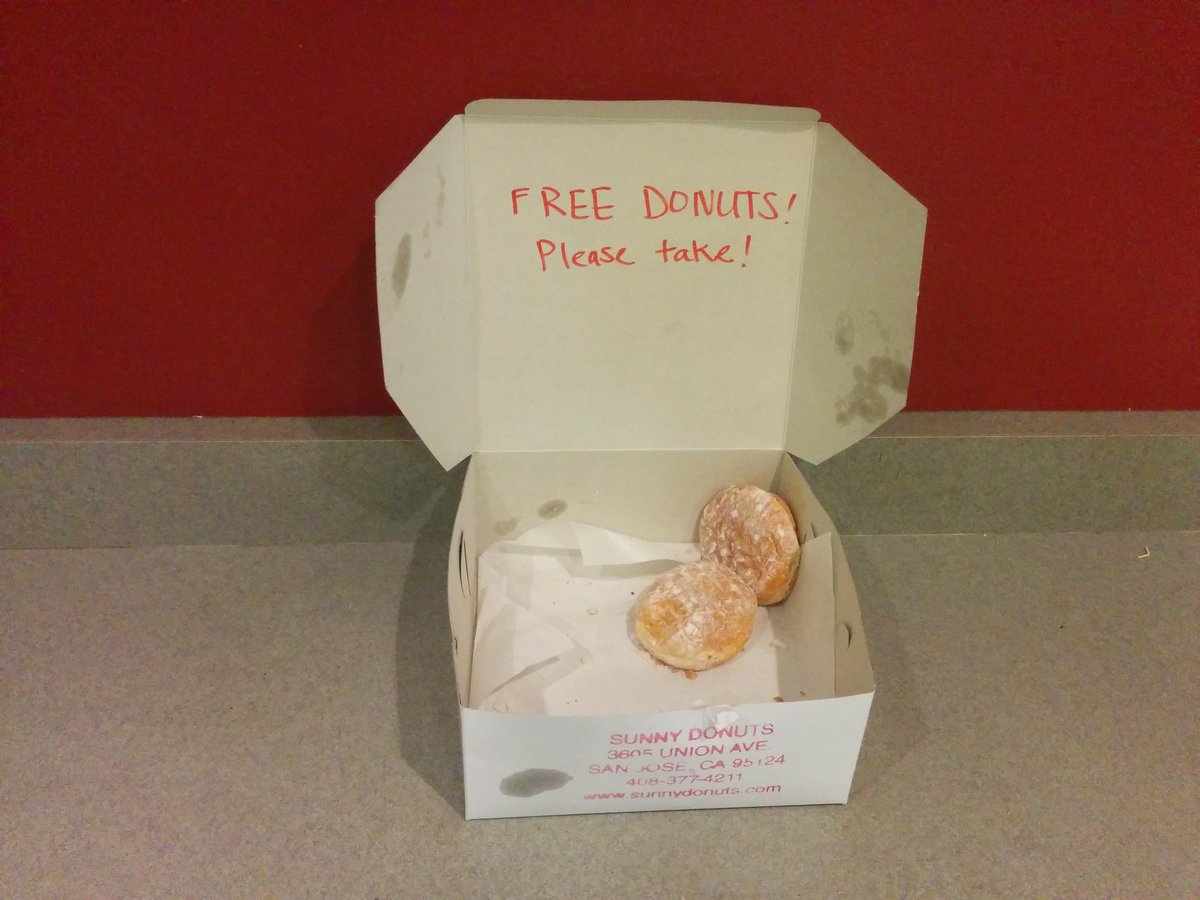 Update: 2 of 12 donuts were left at 4pm. Excellent work, everyone.pic.twitter.com/tfgpS5GGfo