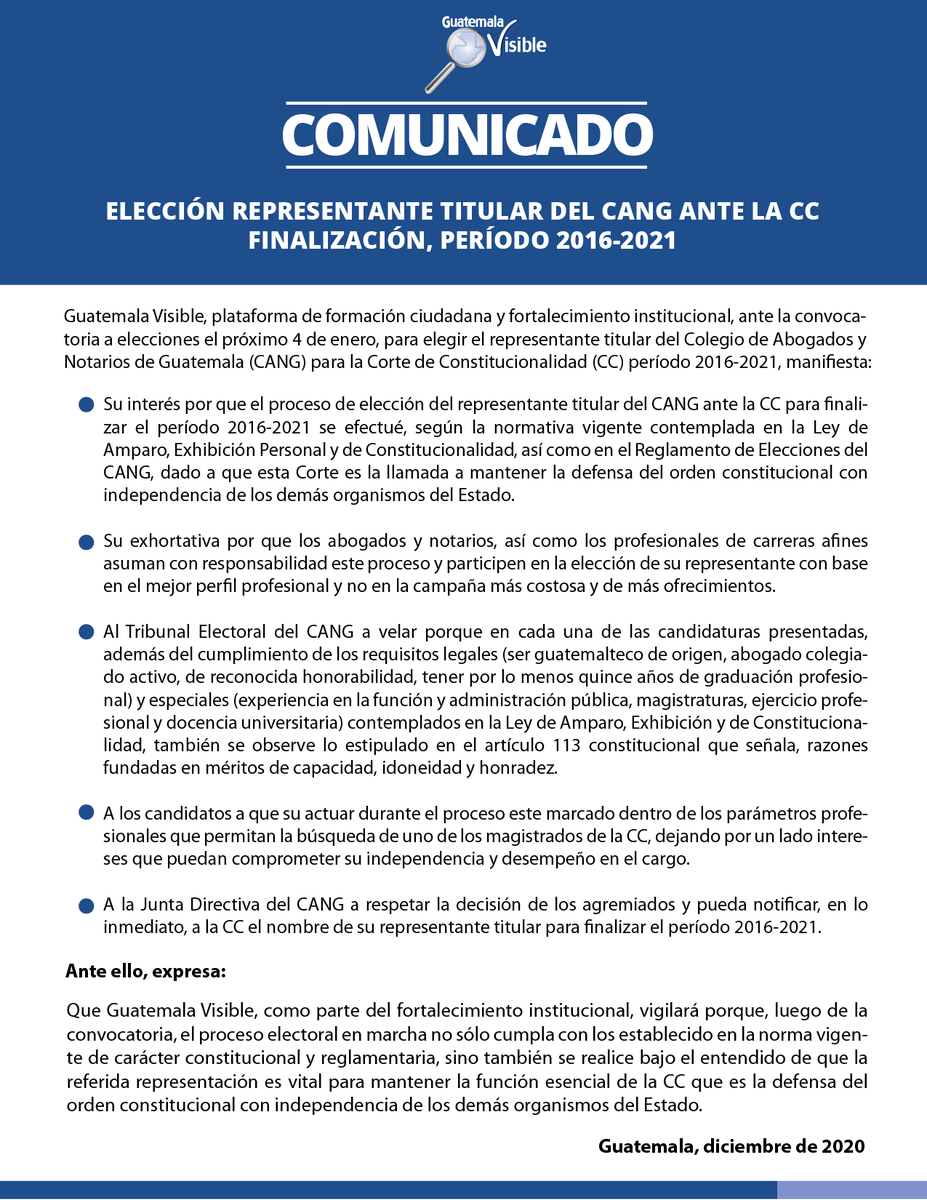 #CCIntachable Comunicado de@guatevisible por la convocatoria a la elección del representante por el@CangGuatemala como magistrado titular ante la@CC_Guatemala , para terminar el período 2016-2021.#EleccionesVisiblespic.twitter.com/whXID2e3sl