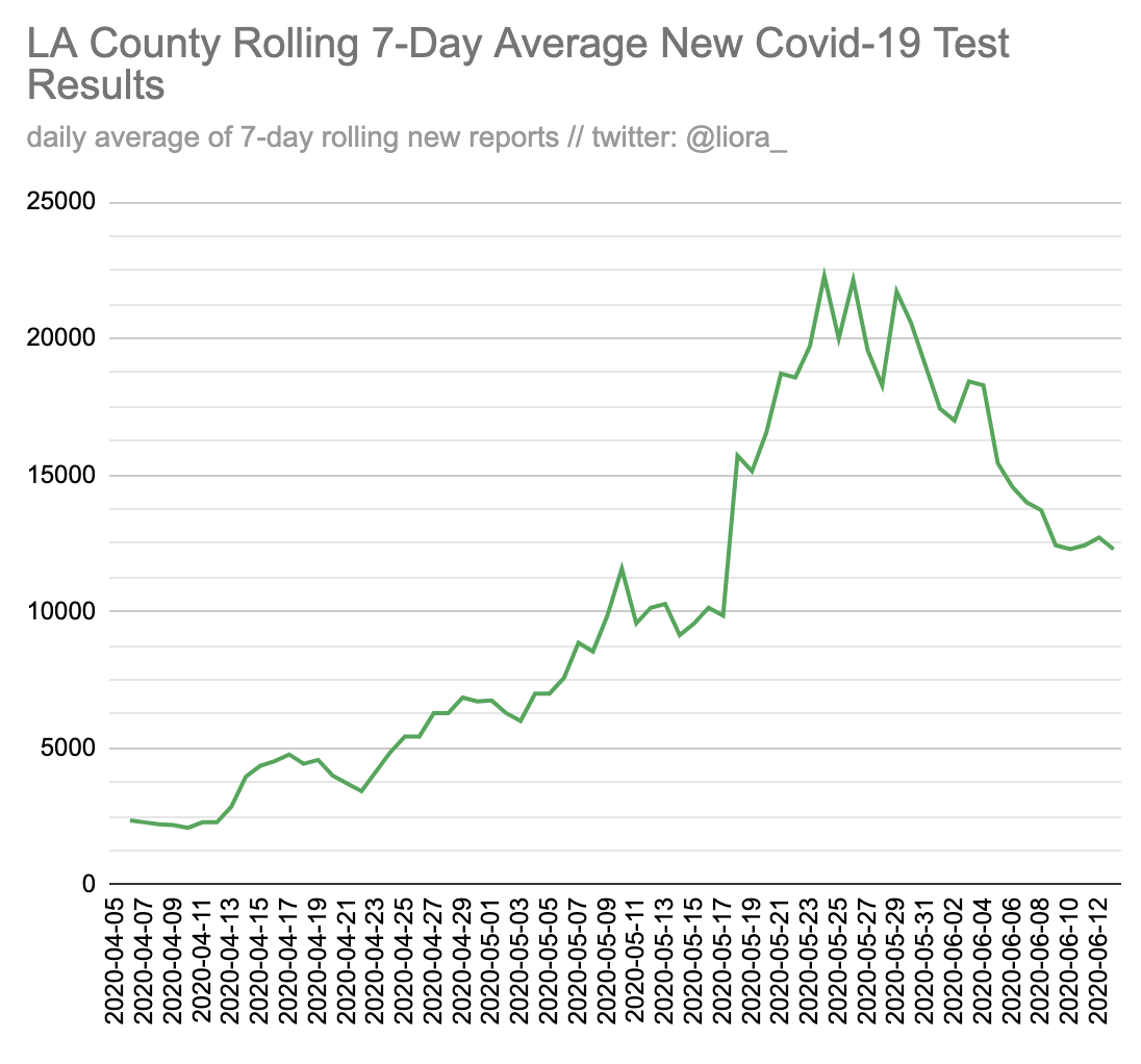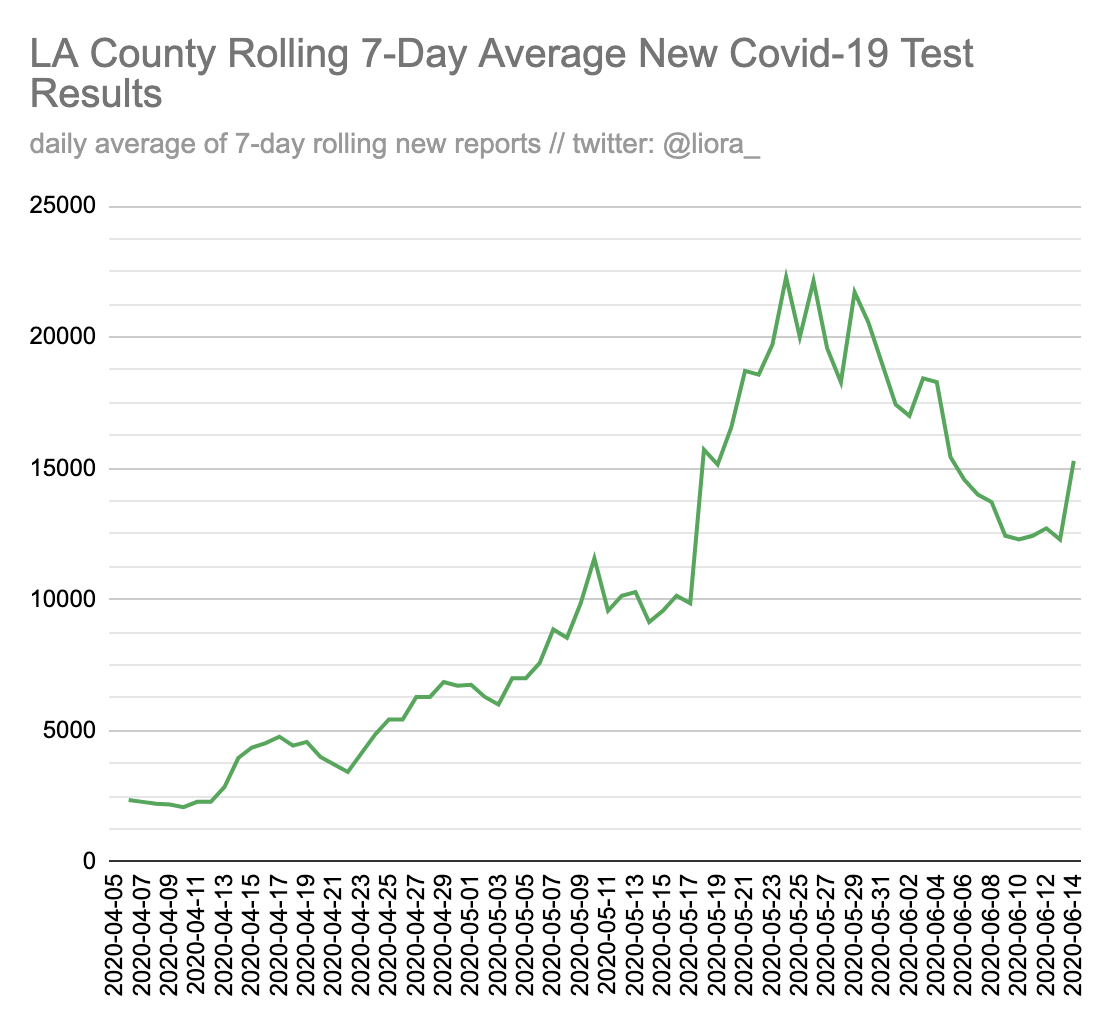 LA County June 20th Update (2/3) The first is that testing appears to have rebounded to pre-protest levels - hopefully stays there. Positivity rates are the lowest since May 29th (accounting for lags, ~post-Memorial Day). This is *in spite* of protest data we'd expect to see.pic.twitter.com/Lc2gsCcZRT