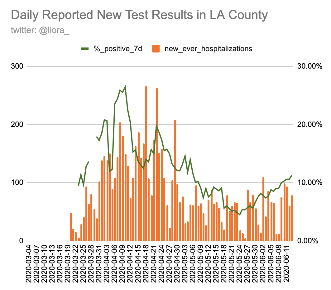 LA County June 23rd Update (2/3) It makes sense that % hospitalized would be low if case counts are going up. Hospitalizations are going up too, just not as quickly - hopefully this isn't because they "lag."pic.twitter.com/Iqi9CSPdjH