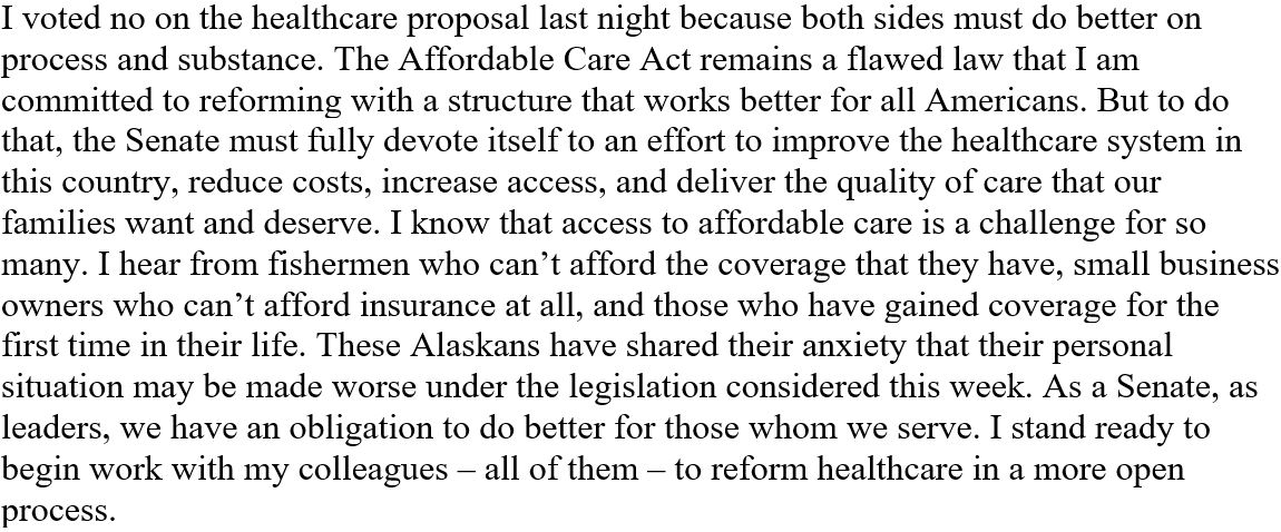 Thank you so much for voting no on that atrocious bill! You have saved millions of lives!! You, Collins, & McCain did not sell out for $$$!!