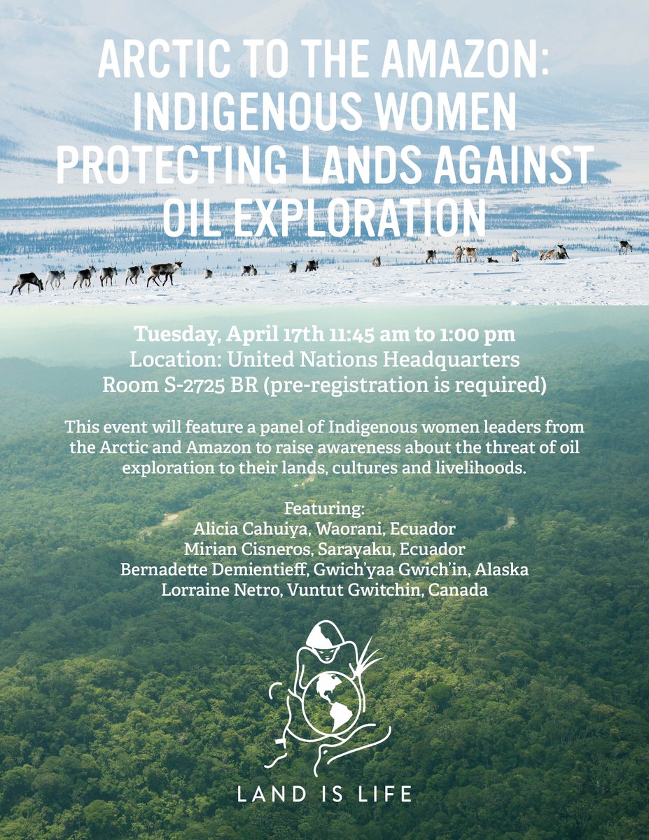 This is happening tomorrow at the #UnitedNations headquarters. Women standing up, speaking out to protect their homes, their people, their culture. #ProtectTheArctic #ProtectTheLand pic.twitter.com/92bC7L64MY