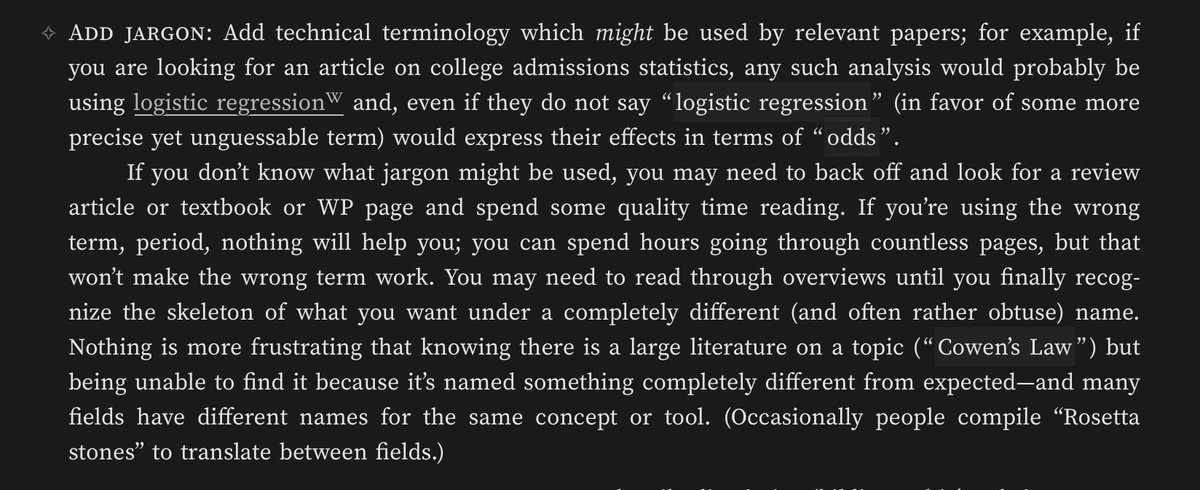 thinking about all the information the case studies convey that a “how to search the internet” list of rules or tips wouldn’t conveyhttps://twitter.com/gwern/status/1219830495585980418 …