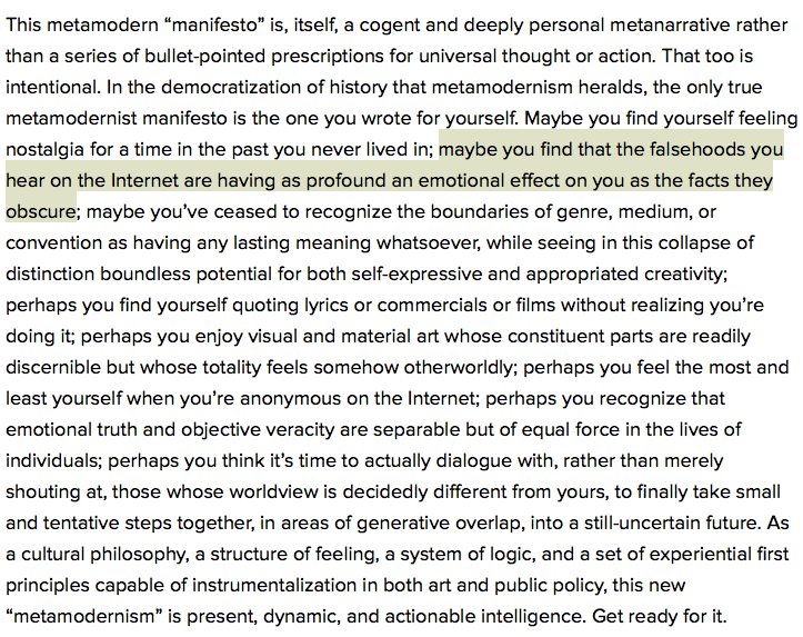 Sorry to live-tweet this stuff at you, but much might be Relevant To Your Interests. This bit is from http://www.huffingtonpost.com/seth-abramson/the-metamodernist-manifes_7_b_6995644.html …pic.twitter.com/MRX0gXwslH